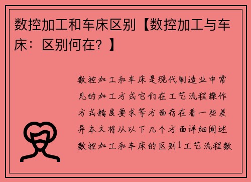 数控车床是一种通过计算机控制的机床,它能够实现高精度的工件加工。数控车床的基本原理是通过计算机控制系统,将工件的加工参数输入到数控系统中,然后通过电机驱动工具刀具进行加工。数控车床具有高精度、高效率、...